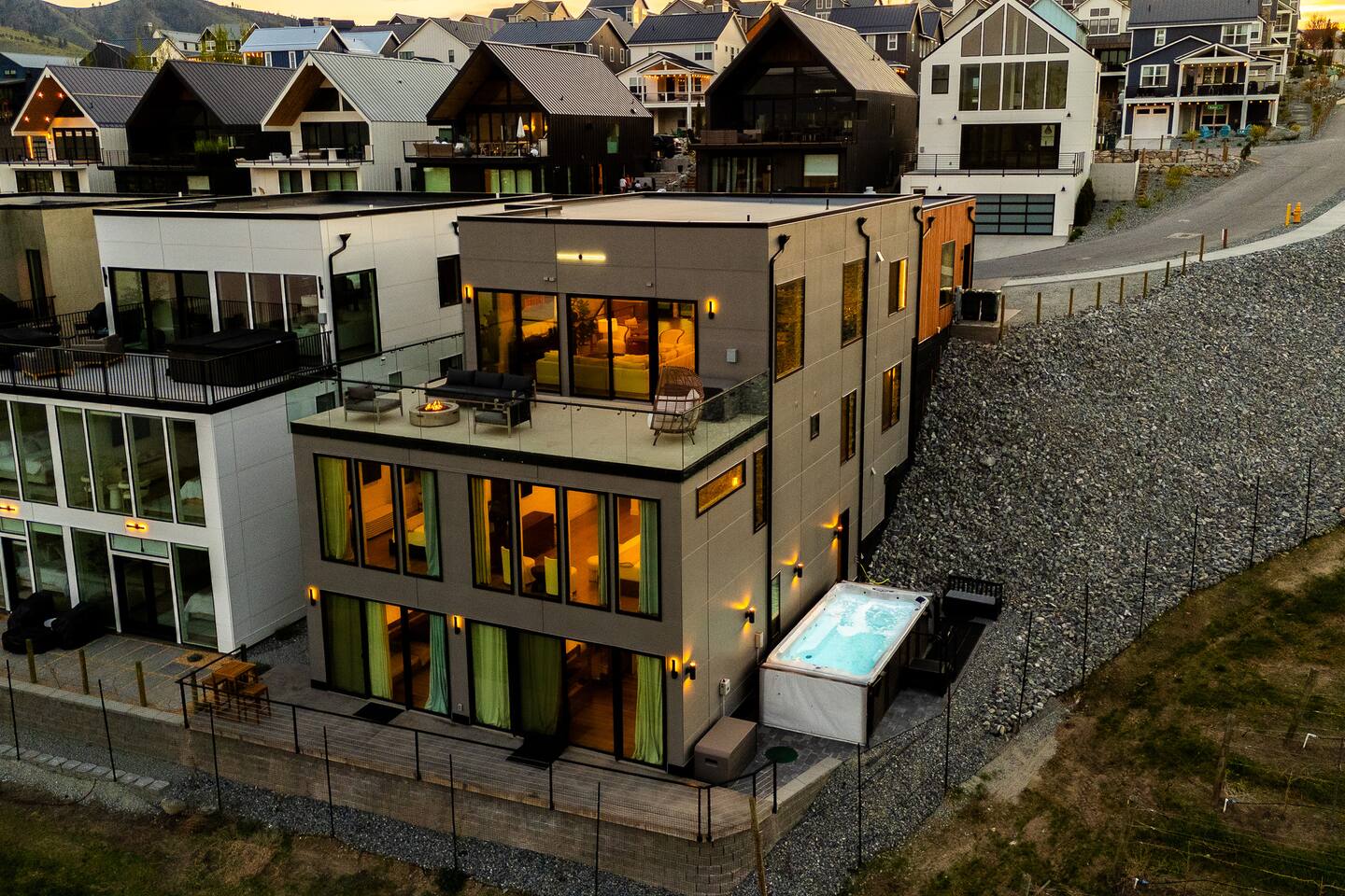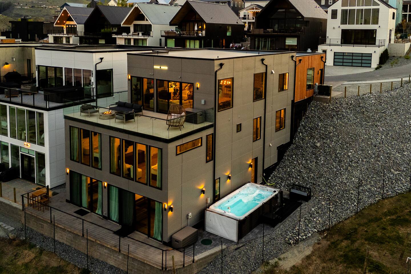 Experience unmatched luxury at Vineyard Villa, a beautifully crafted 6 bedroom, 7 bathroom estate in the heart of the Chelan Lookout Community. Designed for relaxation and comfort, this stunning retreat features a cedar sauna, steam room, cedar cold plunge, and a private swim hot tub. The villa provides stunning Lake Chelan views and access to the community beach.